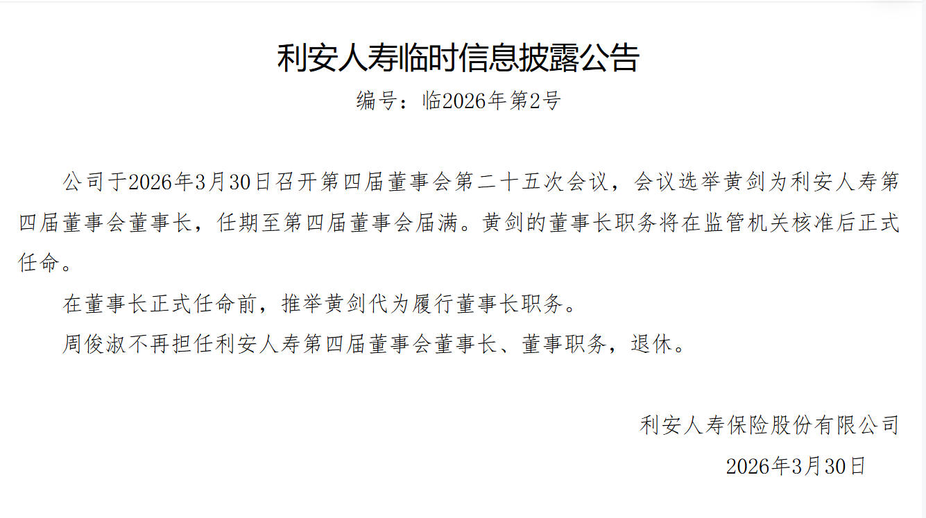 蓝鲸新闻4月1日讯(记者陈晓娟)日前,利安人寿保险股份有限公司(下称“利安人寿”)公告称,选举黄剑为董事长。周俊淑因到龄退休,不再担任公司董事长及董事职务。