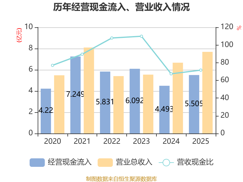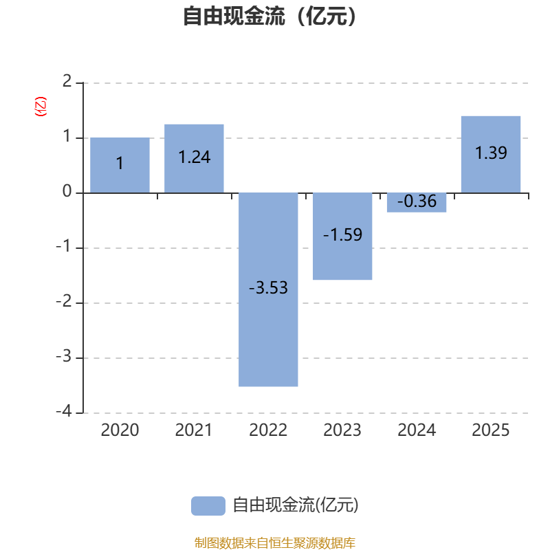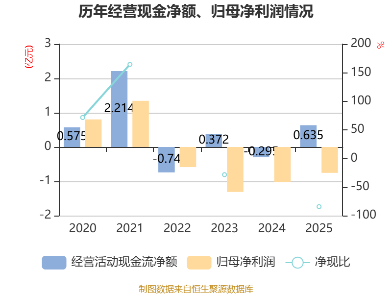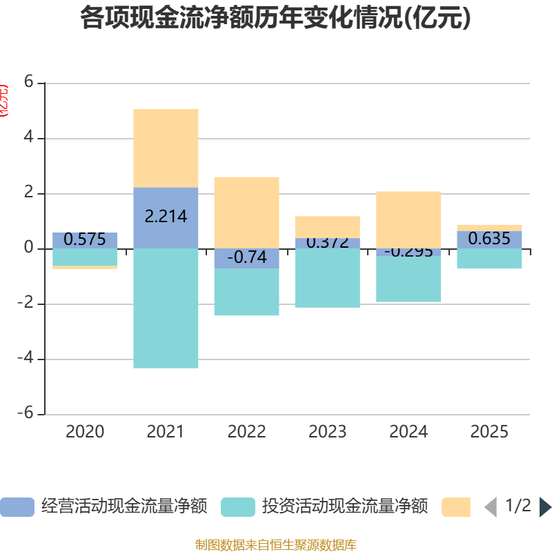 截至2025年,公司经营活动现金流净额为6354.47万元,同比增加9309.39万元;筹资活动现金流净额2183.21万元,同比减少1.84亿元;投资活动现金流净额-7284.9万元,上年同期为-1.64亿元。