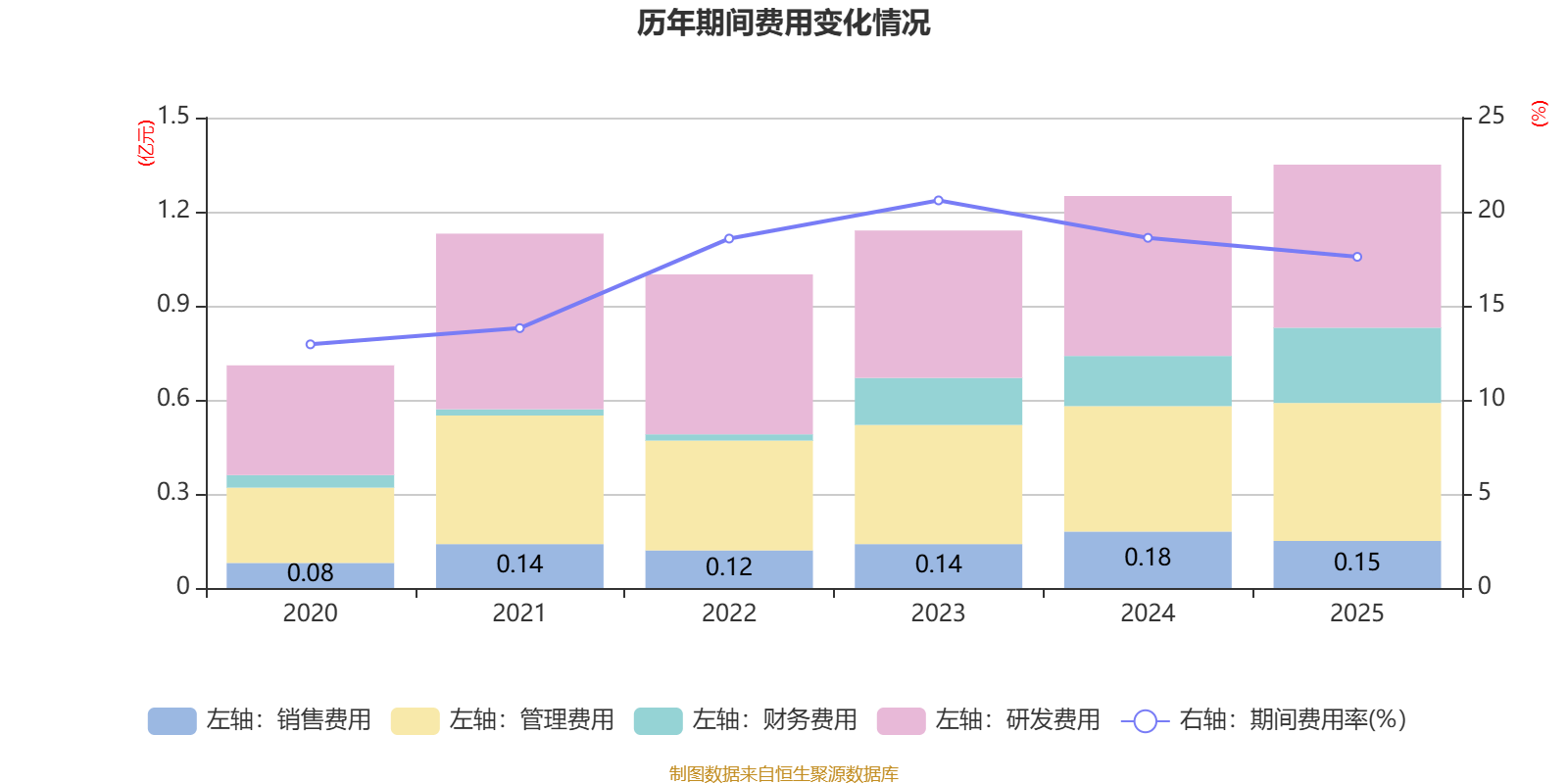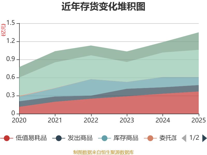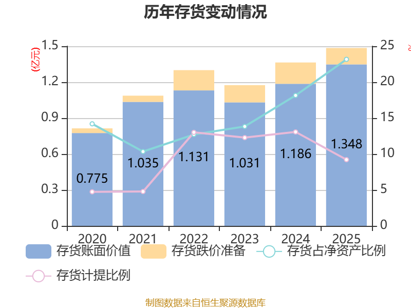从存货变动来看,截至2025年末,公司存货账面价值为1.35亿元,占净资产的23.17%,较上年末增加1623.71万元。其中,存货跌价准备为1368.4万元,计提比例为9.21%。