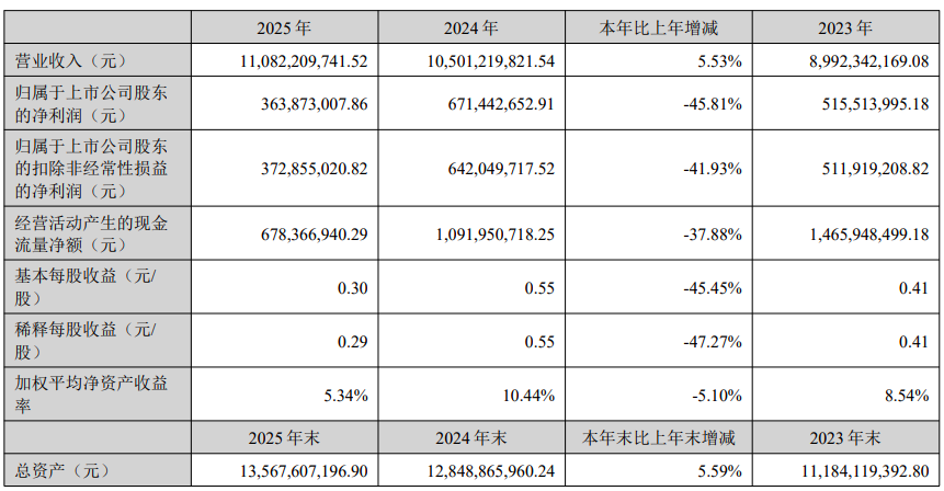 4月1日晚间,智能控制行业龙头拓邦股份(002139.SZ)披露2025年年报,在2024年营收首次突破百亿后,公司在2025年营收继续稳步增长至110.82亿元,同比增长5.53%,但增速较上年的双位数水平显著放缓。值得注意的是,盈利端则遭遇重创:实现归母净利润为3.64亿元,同比骤降45.81%,这一数据处于6年来的低位水平,略高于2019年归母净利润3.27亿元。