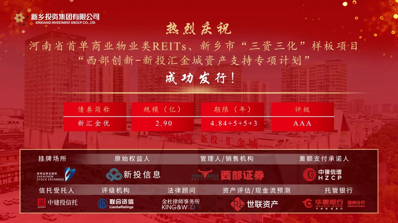 【大河财立方消息】4月1日消息,西部创新-新投汇金城资产支持专项计划(以下简称“类REITs”)近日成功发行,由新乡投资集团旗下新投信息公司作为原始权益人,发行规模4亿元,期限17.84年。该项目是河南省首单商业物业类REITs产品。