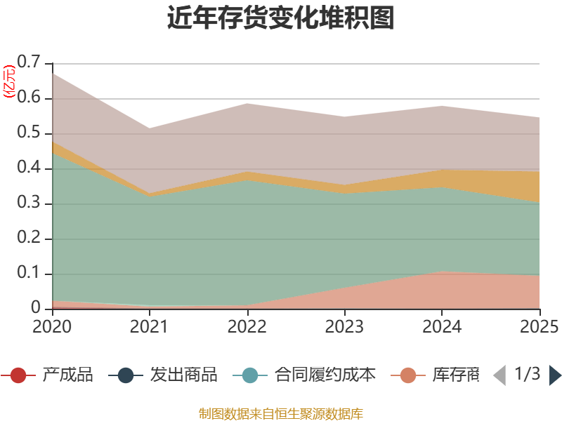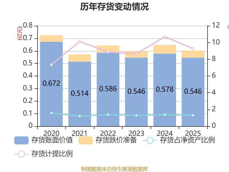 从存货变动来看,截至2025年末,公司存货账面价值为5460.28万元,占净资产的1.29%,较上年末减少324.11万元。其中,存货跌价准备为557.8万元,计提比例为9.27%。