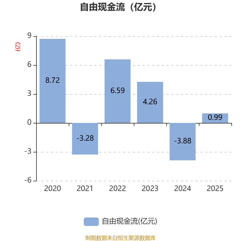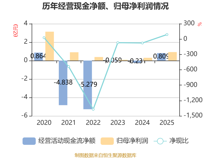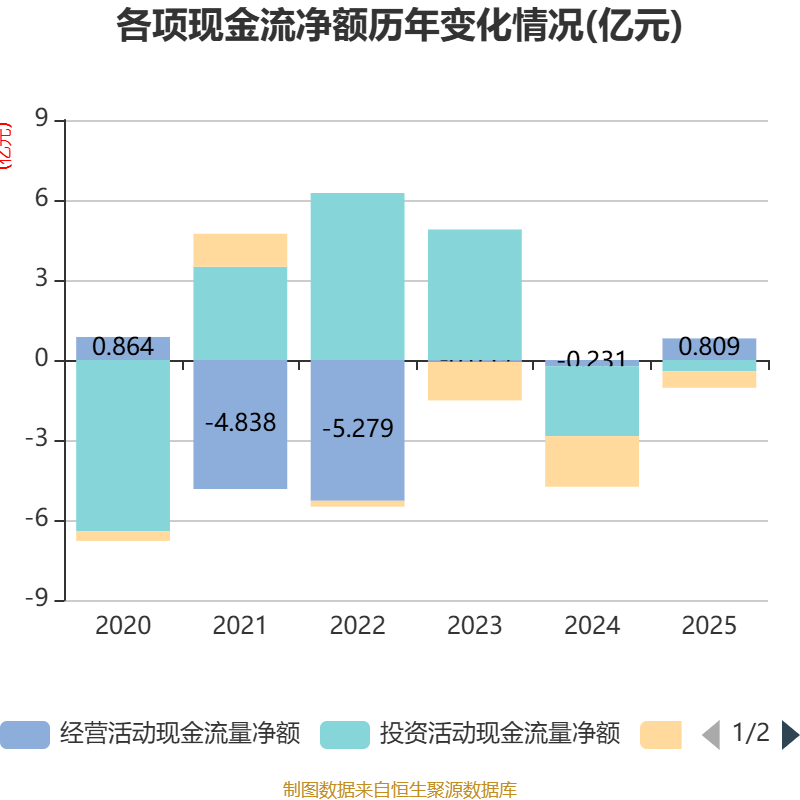 截至2025年,公司经营活动现金流净额为8087.37万元,同比增加1.04亿元;筹资活动现金流净额-6213.98万元,同比增加1.28亿元;投资活动现金流净额-4201.61万元,上年同期为-2.62亿元。