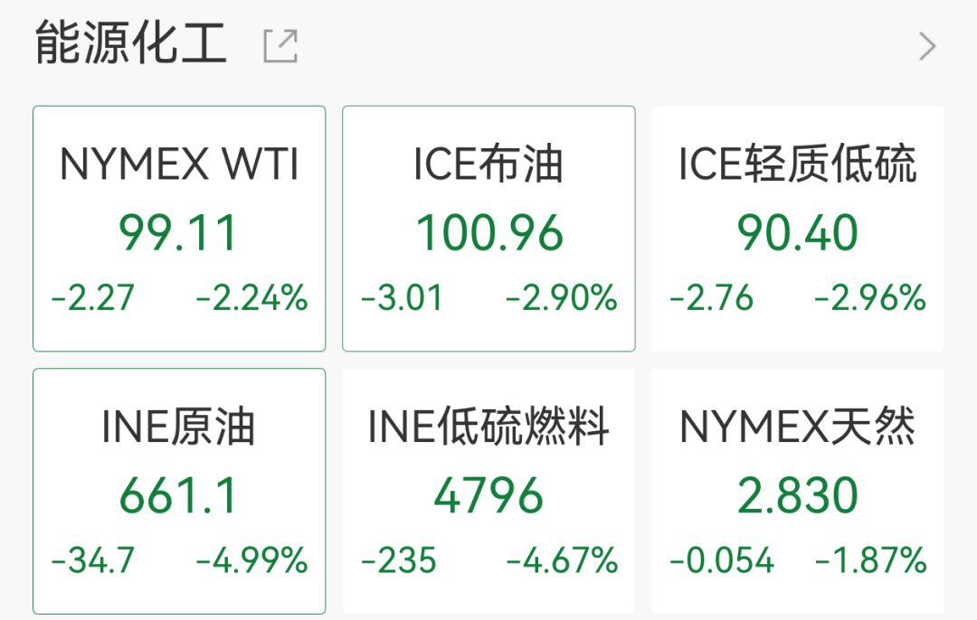 国际原油方面,截至发稿,WTI原油、ICE布油均下挫超2%,WTI原油报99.11美元/桶,ICE原油报100.96美元/桶。
