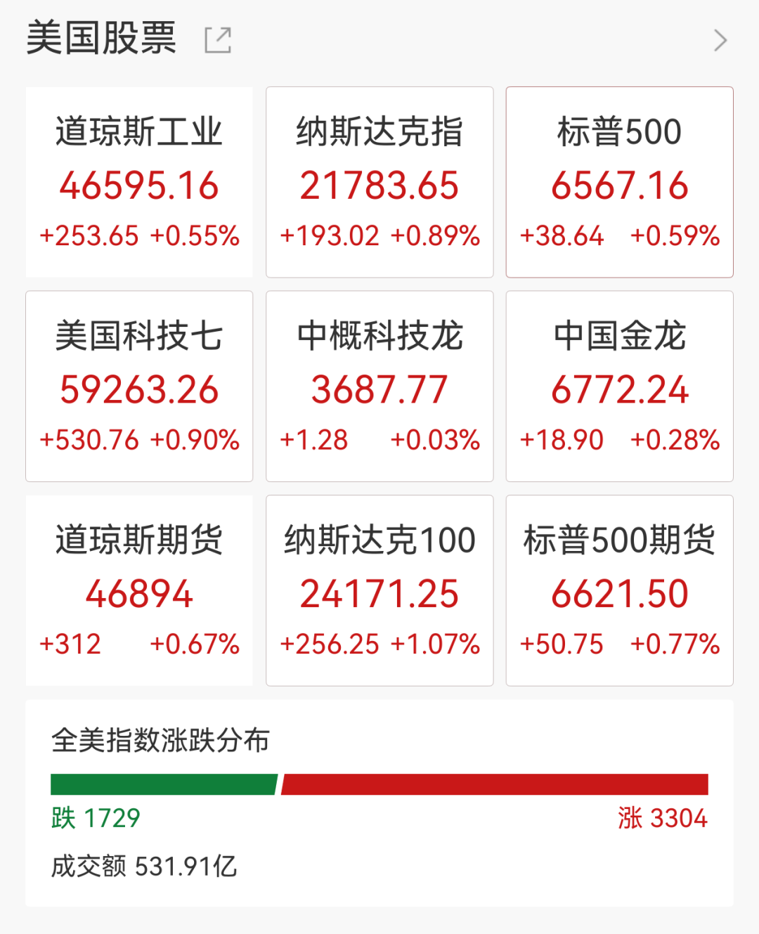 美股三大指数高开高走,截至发稿,道指涨0.55%,纳指涨0.89%,标普500指数涨0.59%。科技股、中概股普涨,存储概念股大涨。黄金涨超2%,国际原油跌超2%。