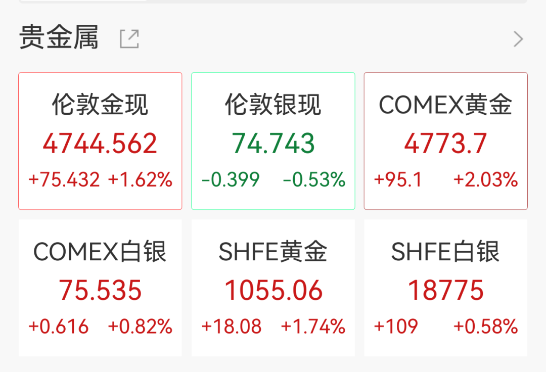 商品方面,黄金白银涨跌不一,现货黄金日内涨1.62%报4744.562美元/盎司,盘中一度涨超2%突破4760美元。现货白银日内跌0.53%报74.74美元/盎司。