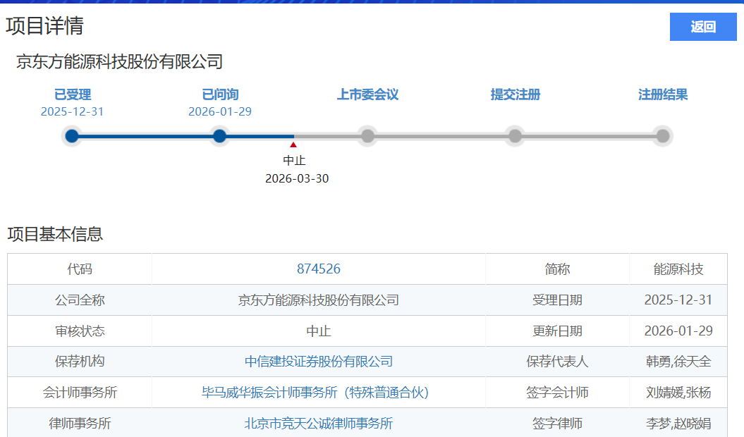 能源科技表示,公司招股说明书引用的财务报告最近一期截止日为2025年6月30日,截至2025年12月31日达到六个月有效期。2025年12月31日,公司已提交《京东方能源科技股份有限公司关于公开发行股票并在北交所上市申请文件审核问询函延期回复的申请》,将财务报告有效期延长至2026年3月31日。