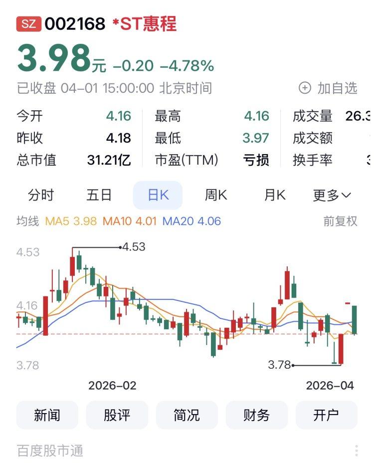 *ST惠程报收3.98元,日涨幅-4.78%,换手率3.36%,今年以来的涨幅为-5.24%。
