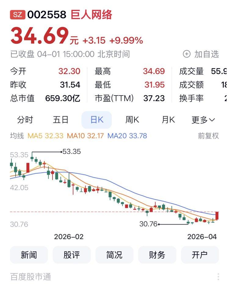 巨人网络报收34.69元,日涨幅9.99%(涨停),列渝股日涨幅第二,换手率2.94%,今年以来的涨幅为-19.87%。