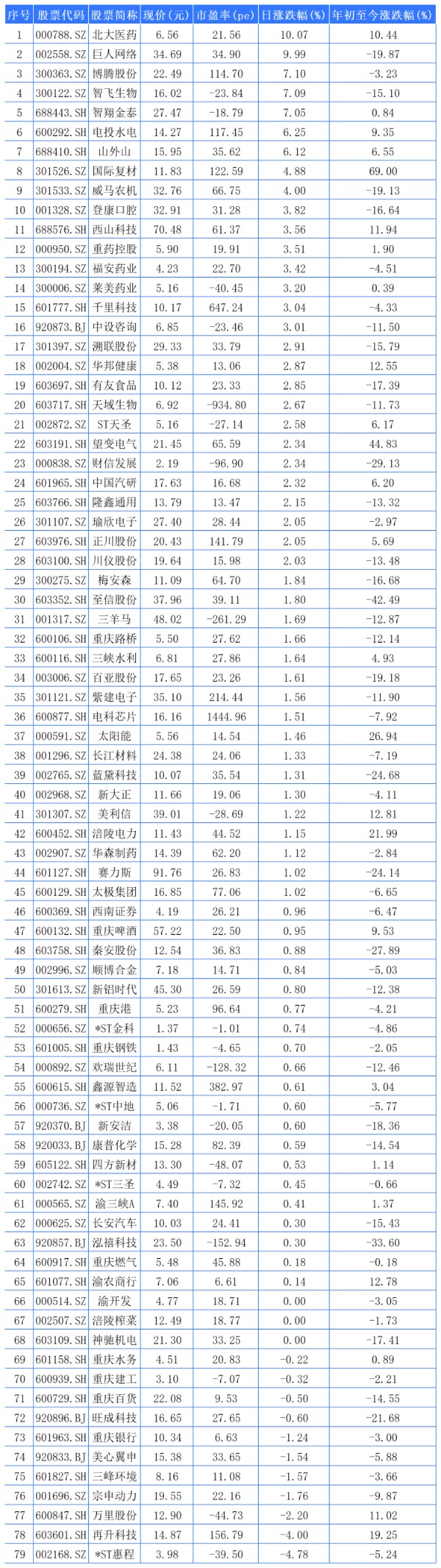 79家重庆A股上市公司中,65家上涨,3家平收,11家下跌。