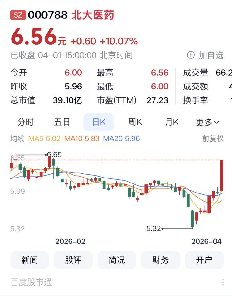 北大医药报收6.56元,日涨幅10.07%(涨停),列渝股日涨幅第一,换手率11.11%,今年以来的涨幅为10.44%。