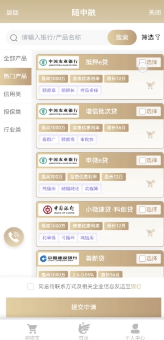 在体验过程中,记者注意到,“找银行”“找产品”这两个功能的设计逻辑,和购物软件十分类似——企业用户“找银行”就像是“找店铺”;“找产品”就像是“选购商品”;选好金融产品可以加入“购物车”;查贷款申请状态就像是看“订单状态”。