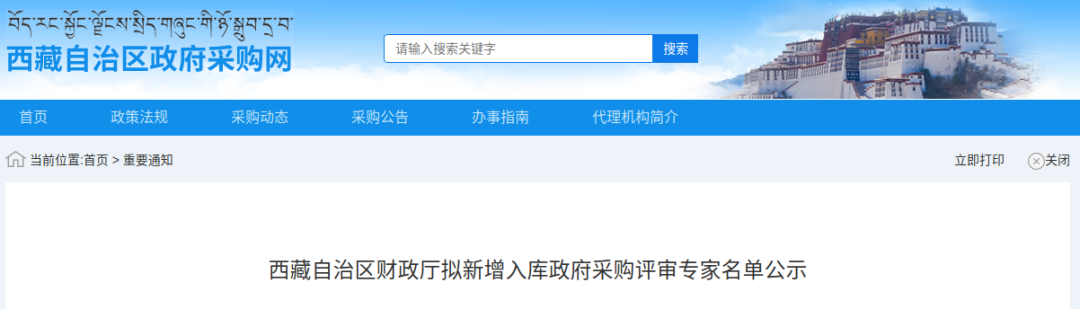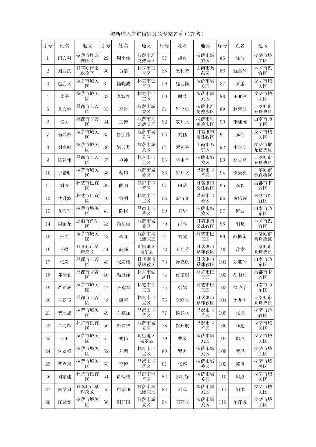 根据《西藏自治区人民政府办公厅关于印发西藏自治区公共资源交易专家库和专家管理办法(试行)的通知》(藏政办函〔2021〕48号,以下简称《专家管理办法》)工作要求,自治区财政厅及各地(市)财政部门近期组织开展了2026年西藏自治区第一批政府采购评审专家的审核工作,申请新增入库的政府采购专家三级审核工作已完成。现将通过三级审核拟新增入库的政府采购专家名单(详见附件)予以公示,公示期自公示发布之日起5个工作日,如对公示内容有异议,请在公示期内向西藏自治区财政厅(自治区政府采购管理办公室)反映,联系电话:0891—6284709。