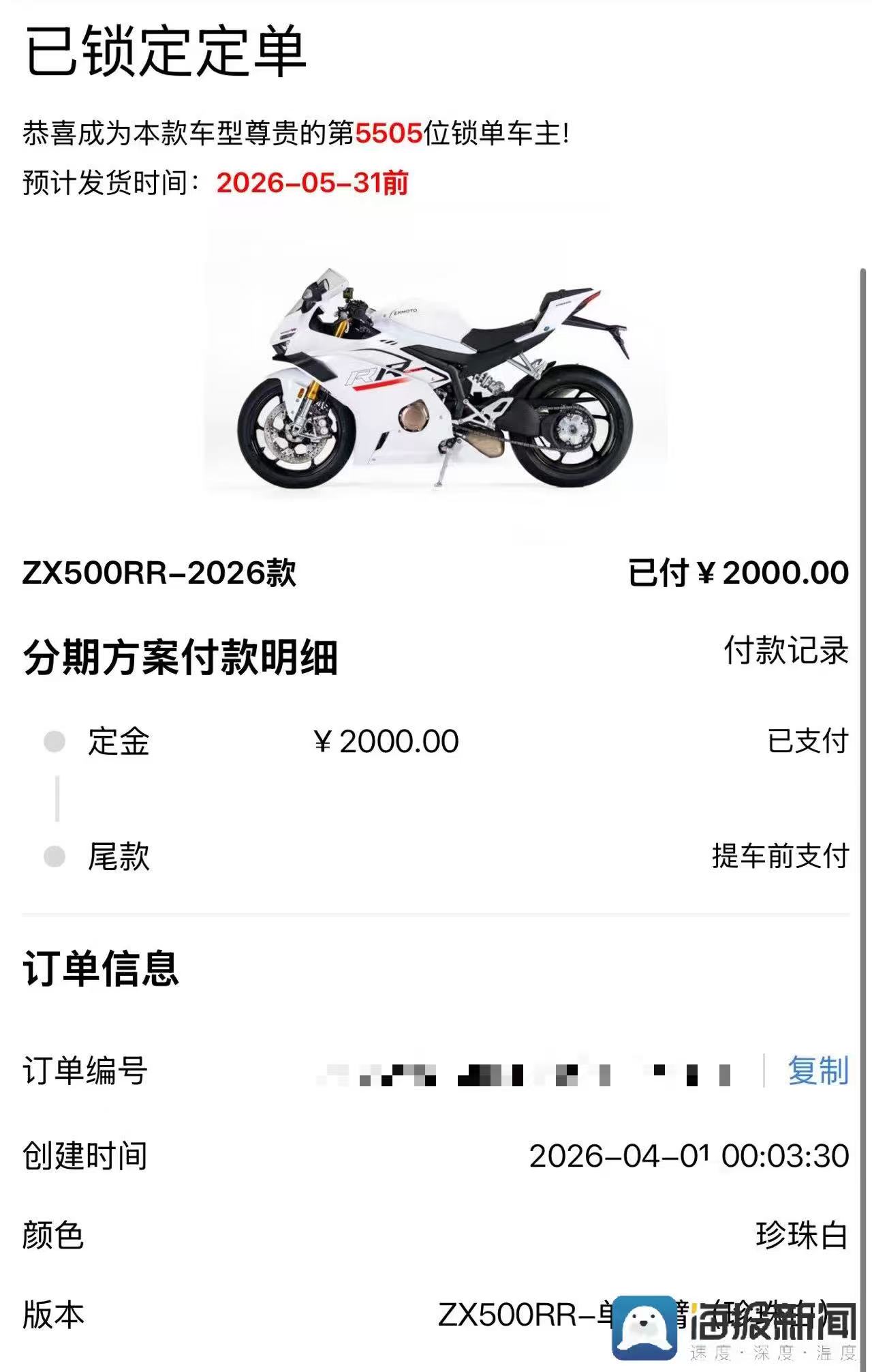 该门店工作人员告诉记者,自法国车手驾驶张雪机车夺冠喜讯传开后,该门店的到店咨询量、预约试驾量均大幅攀升,消费者对国货机车的认可度与期待值也持续走高。其中,顾客郭女士于4月1日凌晨订购的ZX500RR-2026款张雪机车,已是该车型的第5505位锁单车主,预计将于5月31日前发货,需要等待一个多月。
