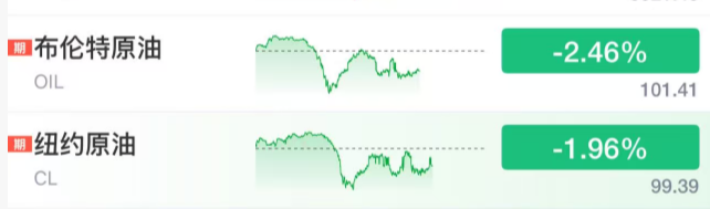 受此影响,油价出现回落。西德州中质原油(WTI)期货下跌约2%,布伦特原油期货下跌超2%,至每桶101美元上方。