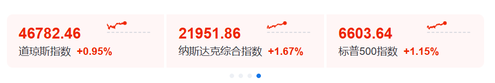标普500指数涨超1%,纳斯达克综合指数上涨1.67%,道琼斯工业平均指数上涨超400点,涨幅达0.95%。