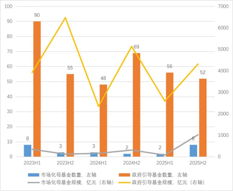 在新设立方面,2025年新发起成立的母基金共118只,总规模达8006.57亿元。其中,政府引导基金规模为6904.11亿元,同比下降7.73%;而市场化母基金规模达到1102.46亿元,同比大幅增长134.57%,这一显著增幅主要得益于国家创投引导基金的设立。