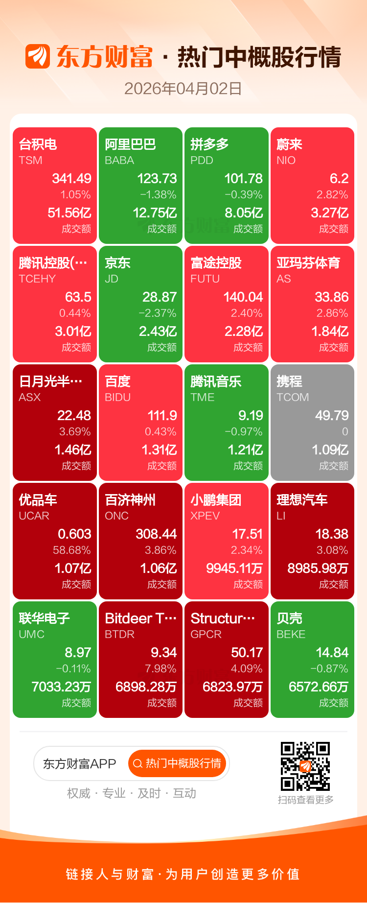 台积电涨1.05%,阿里巴巴跌1.38%,拼多多跌0.39%,蔚来涨2.82%,腾讯控股(ADR)涨0.44%,京东跌2.37%,富途控股涨2.40%,亚玛芬体育涨2.86%,日月光半导体涨3.69%,百度涨0.43%。