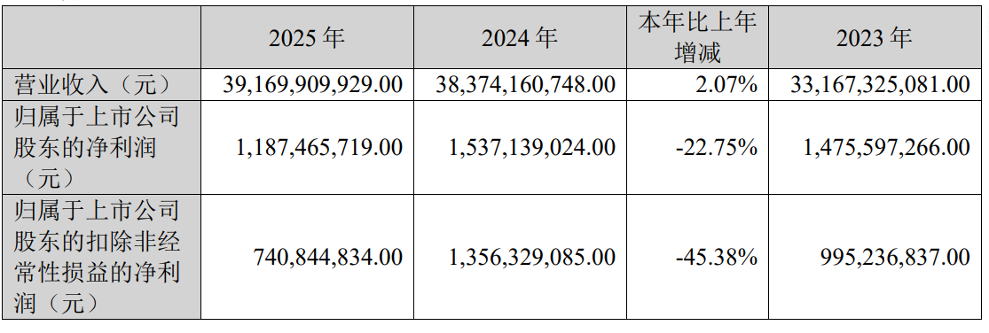 2025年,江铃汽车交出了归母净利润11.87亿元的成绩单,同比下滑22.75%。但这还不是最糟糕的,扣除非经常性损益后的净利润为7.41亿元,同比减少45.38%。