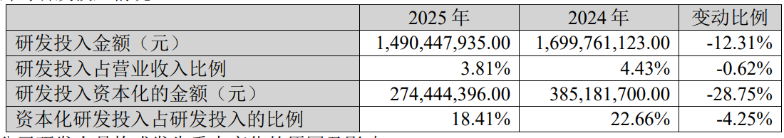 数据显示,2025年江铃汽车的研发投入金额同比减少12.31%,为14.9亿元,其中资本化研发投入更是减少28.75%。这一数据与公司年报中大篇幅强调的“智能网联、新能源、轻量化”等技术储备形成了鲜明的反差。