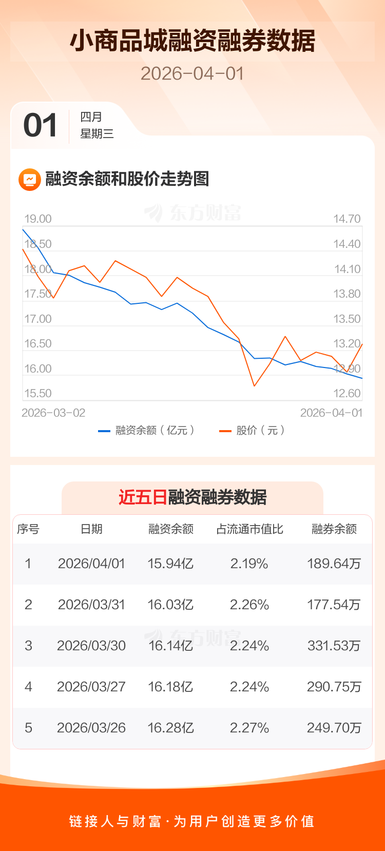 交易所最新数据显示,小商品城于2026年4月1日获融资买入4013.70万元,融资偿还4874.02万元,当日融资净偿还860.32万元。目前,该股融资余额15.94亿,占流通市值比例为2.19%。