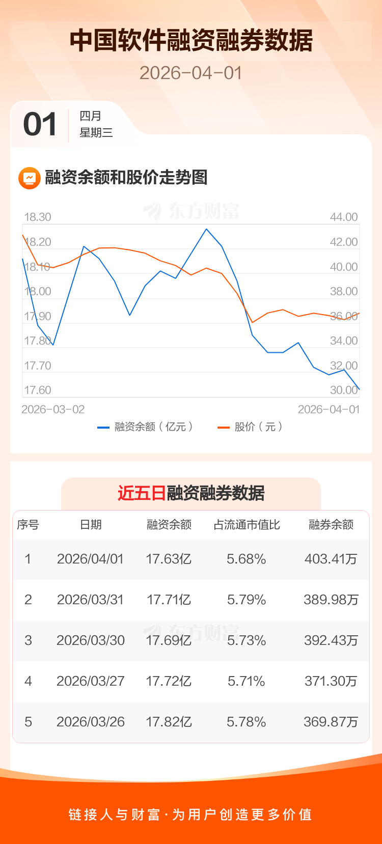 交易所最新数据显示,中国软件于2026年4月1日获融资买入2699.62万元,融资偿还3425.89万元,当日融资净偿还726.28万元。目前,该股融资余额17.63亿,占流通市值比例为5.68%。