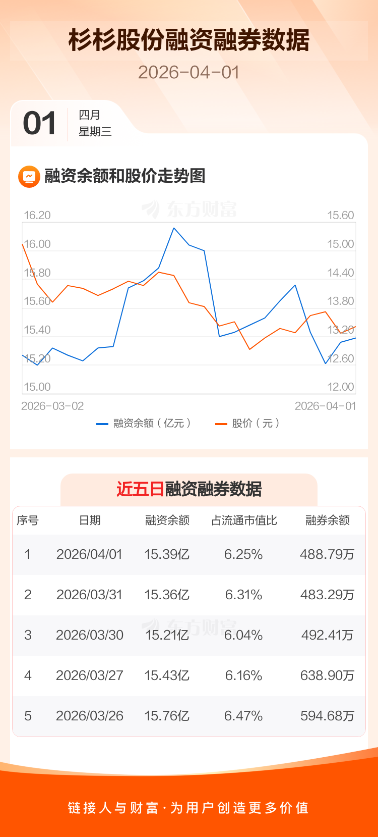 交易所最新数据显示,杉杉股份于2026年4月1日获融资买入4394.88万元,融资偿还4166.18万元,当日融资净买入228.7万元。目前,该股融资余额15.39亿,占流通市值比例为6.25%。