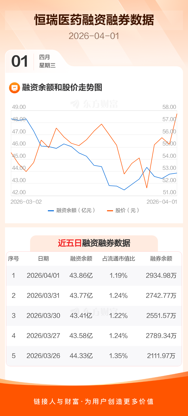 交易所最新数据显示,恒瑞医药于2026年4月1日获融资买入3.30亿元,融资偿还3.22亿元,当日融资净买入847.37万元。目前,该股融资余额43.86亿,占流通市值比例为1.19%。