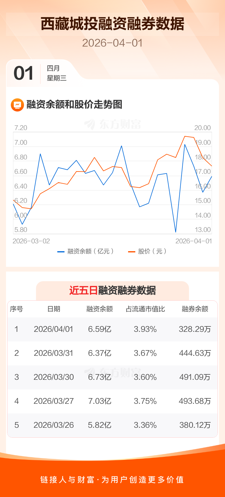 交易所最新数据显示,西藏城投于2026年4月1日获融资买入6973.76万元,融资偿还4693.55万元,当日融资净买入2280.21万元。目前,该股融资余额6.59亿,占流通市值比例为3.93%。
