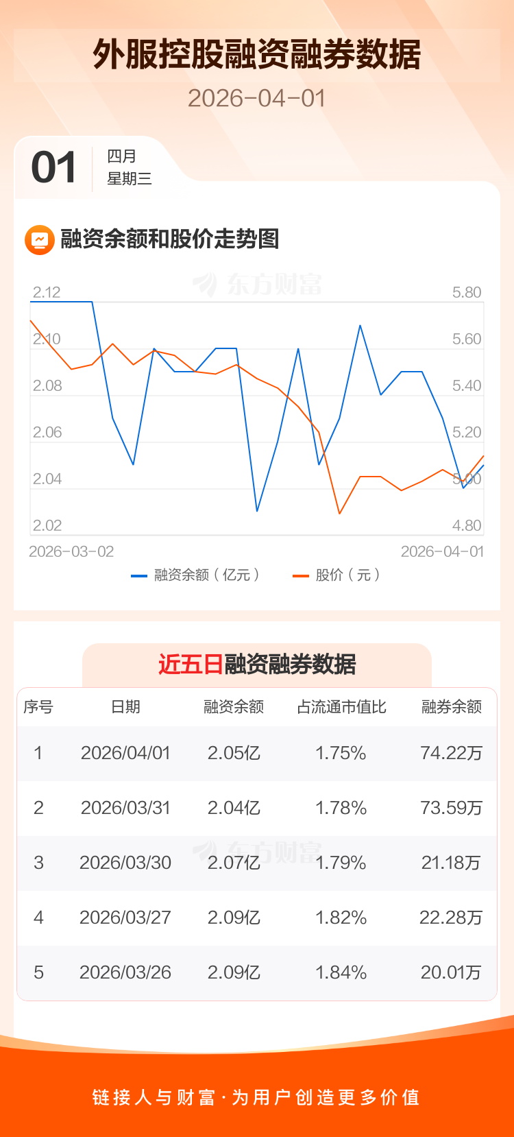 交易所最新数据显示,外服控股于2026年4月1日获融资买入726.84万元,融资偿还648.38万元,当日融资净买入78.45万元。目前,该股融资余额2.05亿,占流通市值比例为1.75%。