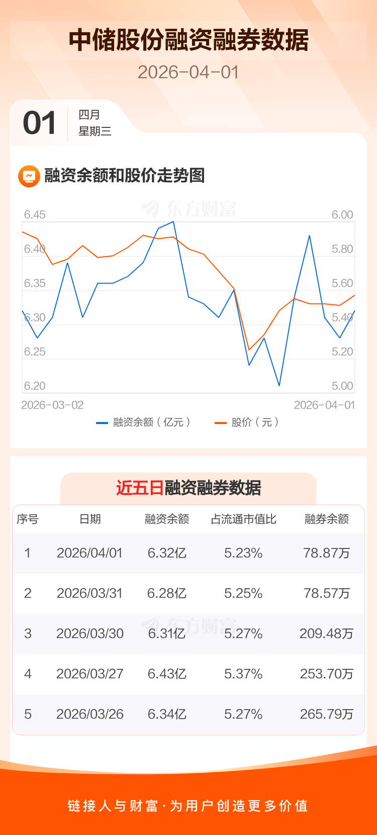 交易所最新数据显示,中储股份于2026年4月1日获融资买入1729.13万元,融资偿还1309.90万元,当日融资净买入419.23万元。目前,该股融资余额6.32亿,占流通市值比例为5.23%。