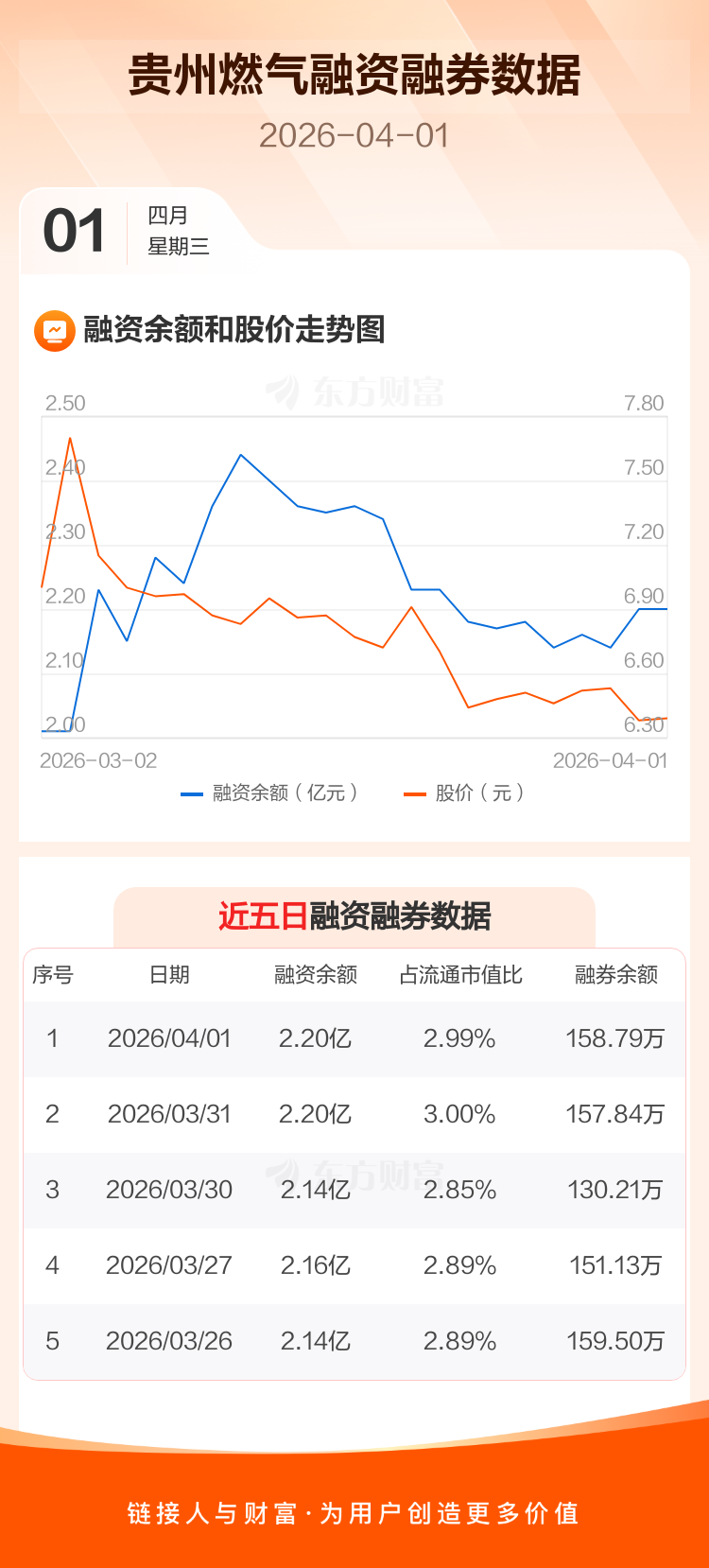 交易所最新数据显示,贵州燃气于2026年4月1日获融资买入774.69万元,融资偿还839.35万元,当日融资净偿还64.66万元。目前,该股融资余额2.20亿,占流通市值比例为2.99%。