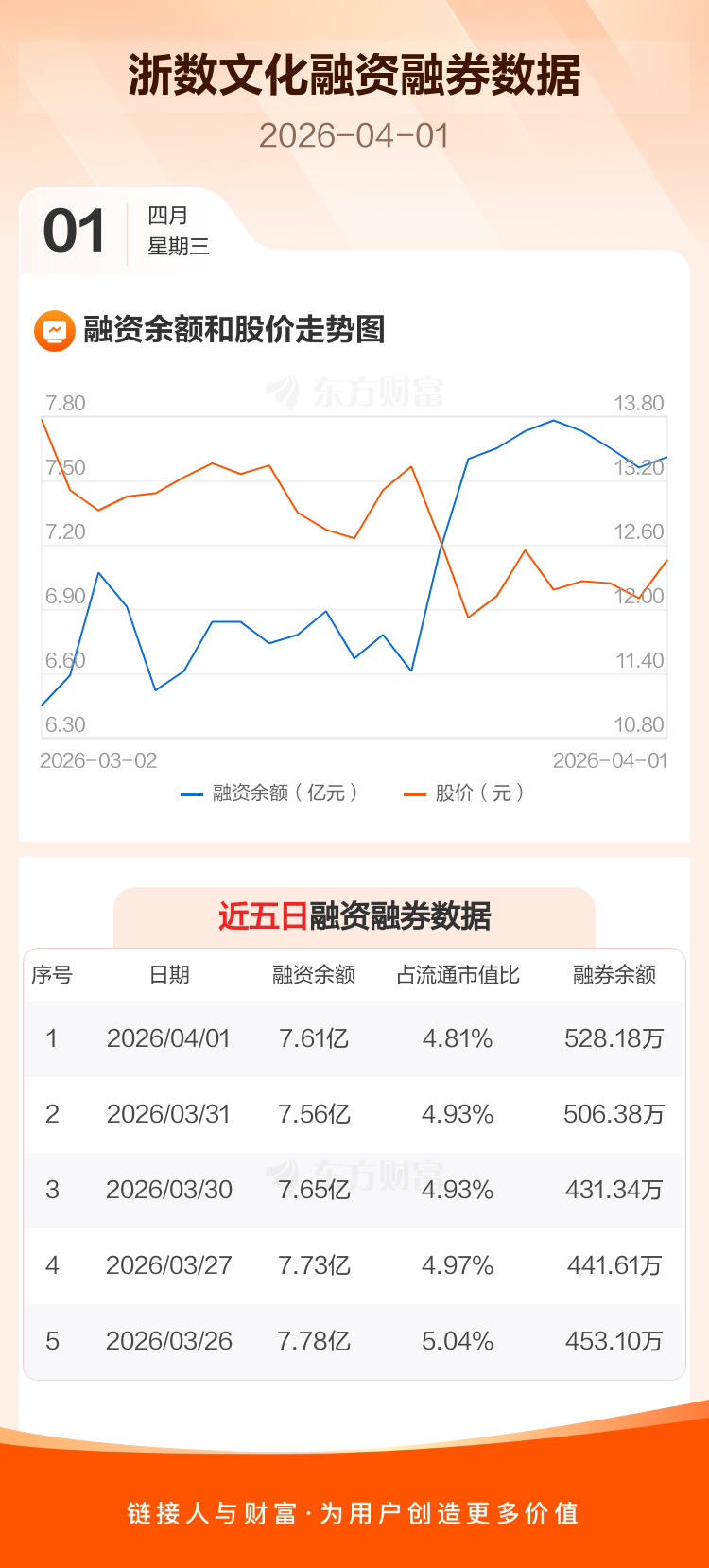 交易所最新数据显示,浙数文化于2026年4月1日获融资买入3026.96万元,融资偿还2554.15万元,当日融资净买入472.81万元。目前,该股融资余额7.61亿,占流通市值比例为4.81%。