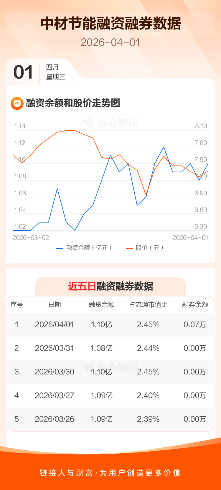 交易所最新数据显示,中材节能于2026年4月1日获融资买入813.63万元,融资偿还628.66万元,当日融资净买入184.98万元。目前,该股融资余额1.10亿,占流通市值比例为2.45%。