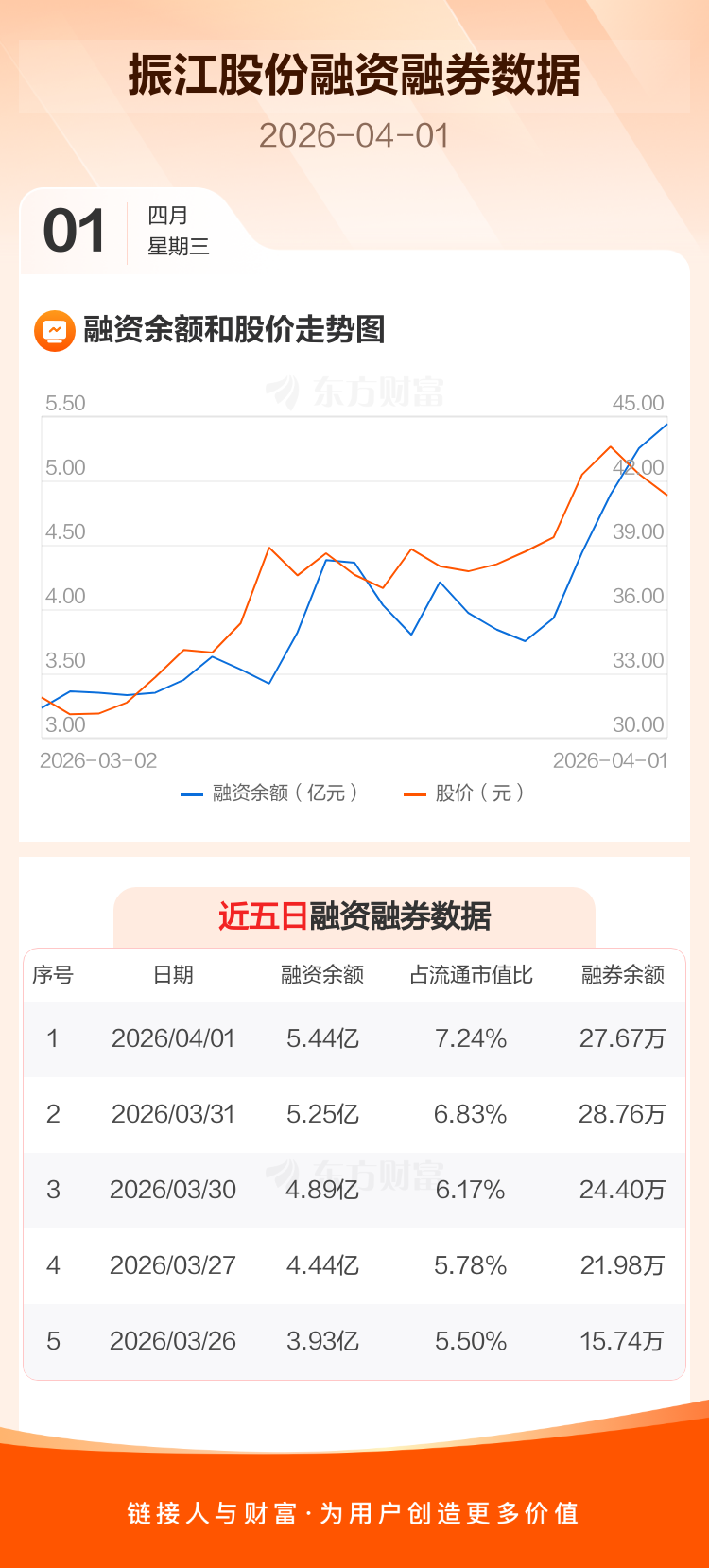交易所最新数据显示,振江股份于2026年4月1日获融资买入1.08亿元,融资偿还8946.24万元,当日融资净买入1838.79万元。目前,该股融资余额5.44亿,占流通市值比例为7.24%。