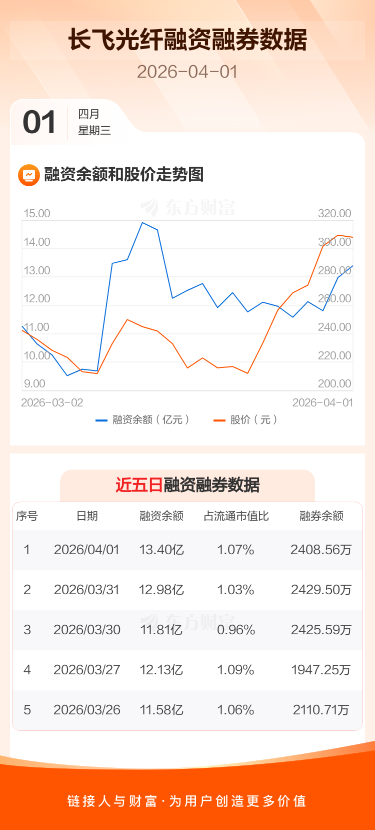交易所最新数据显示,长飞光纤于2026年4月1日获融资买入5.34亿元,融资偿还4.92亿元,当日融资净买入4148.38万元。目前,该股融资余额13.40亿,占流通市值比例为1.07%。