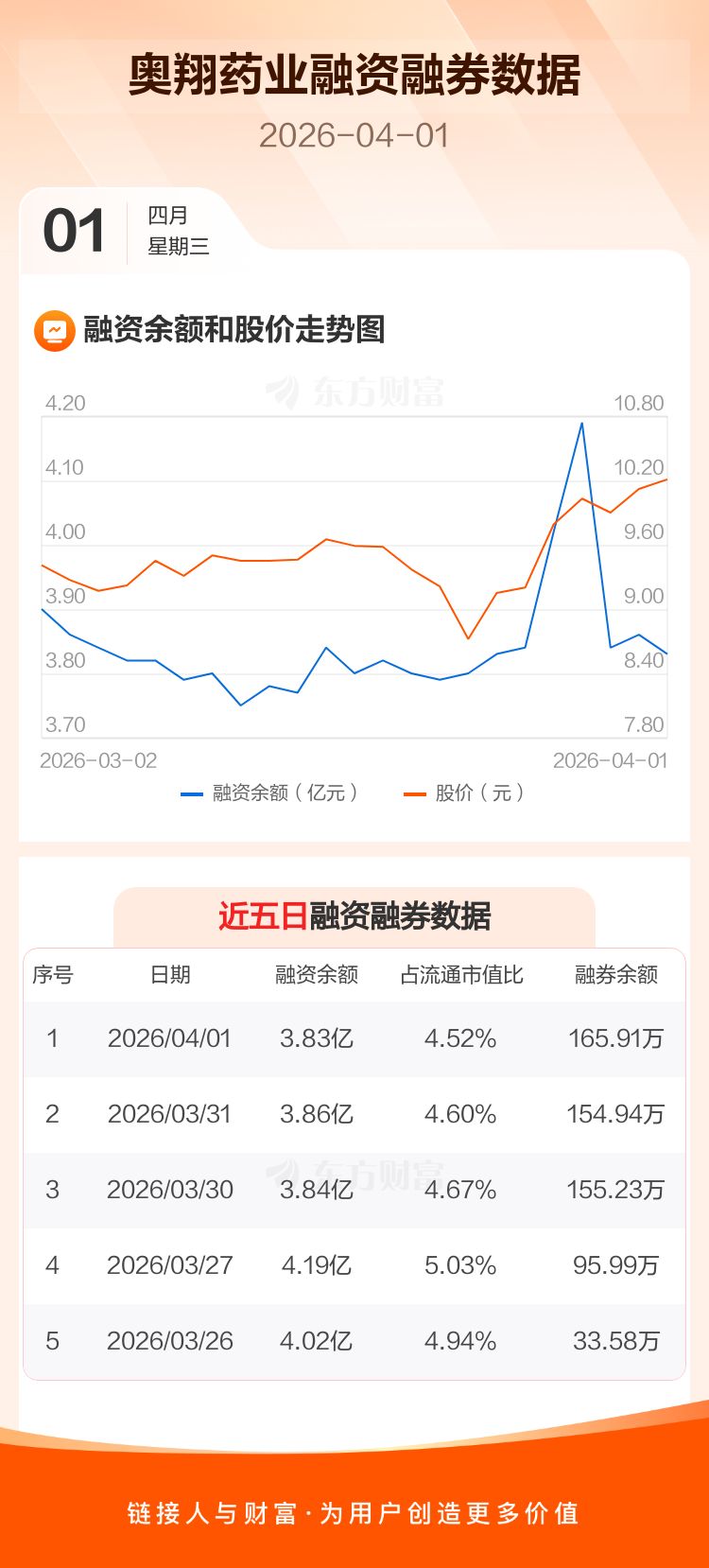 交易所最新数据显示,奥翔药业于2026年4月1日获融资买入2222.35万元,融资偿还2553.54万元,当日融资净偿还331.19万元。目前,该股融资余额3.83亿,占流通市值比例为4.52%。