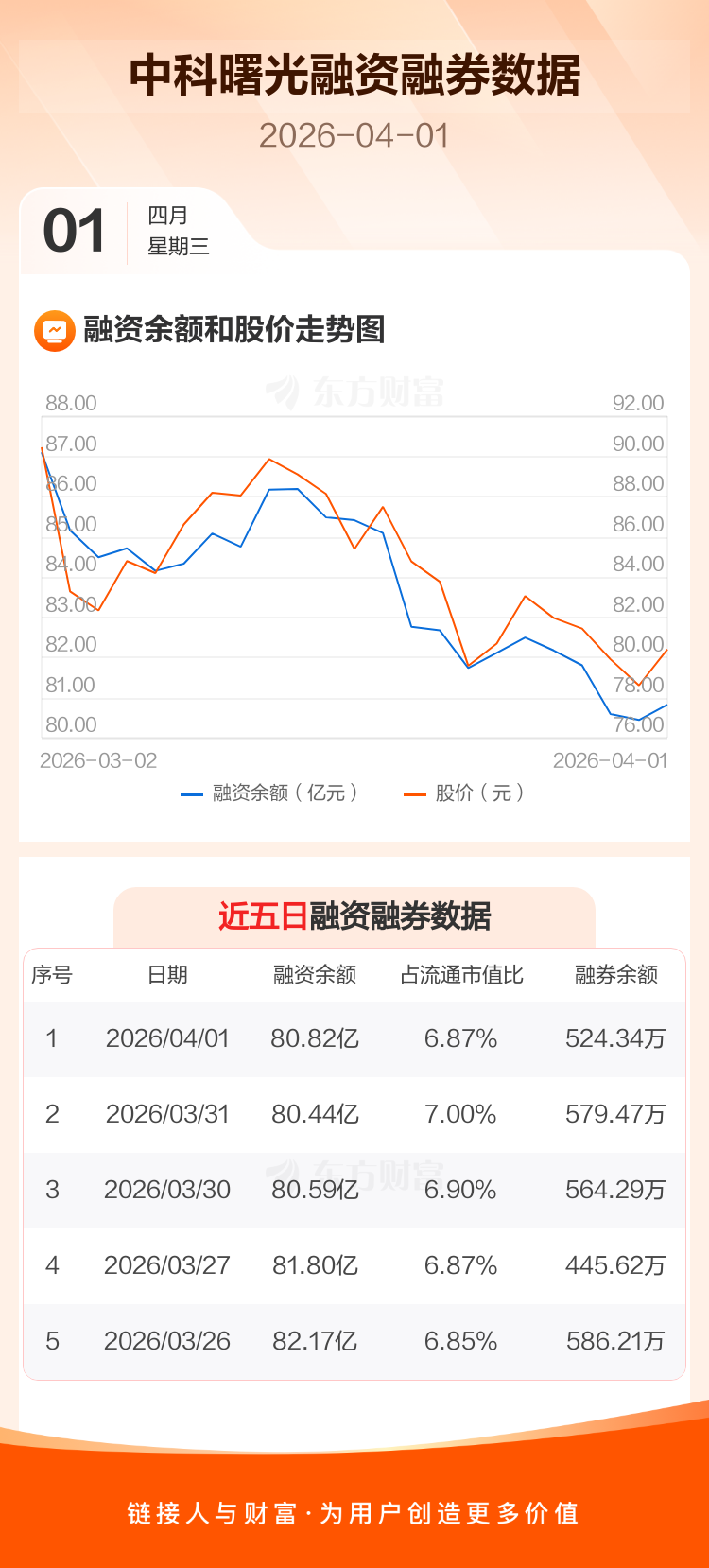交易所最新数据显示,中科曙光于2026年4月1日获融资买入2.91亿元,融资偿还2.53亿元,当日融资净买入3785.69万元。目前,该股融资余额80.82亿,占流通市值比例为6.87%。