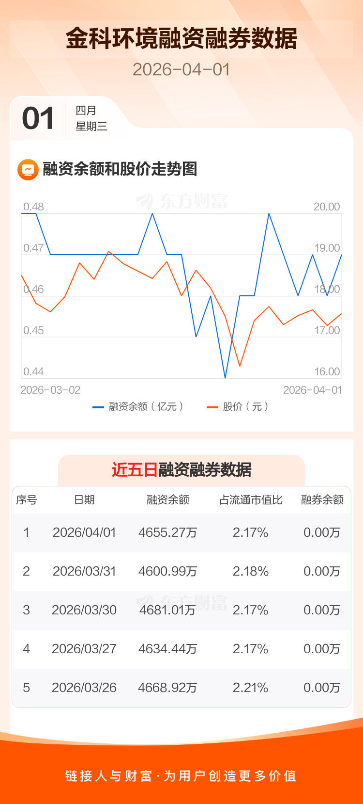 交易所最新数据显示,金科环境于2026年4月1日获融资买入232.14万元,融资偿还177.86万元,当日融资净买入54.28万元。目前,该股融资余额4655.27万,占流通市值比例为2.17%。