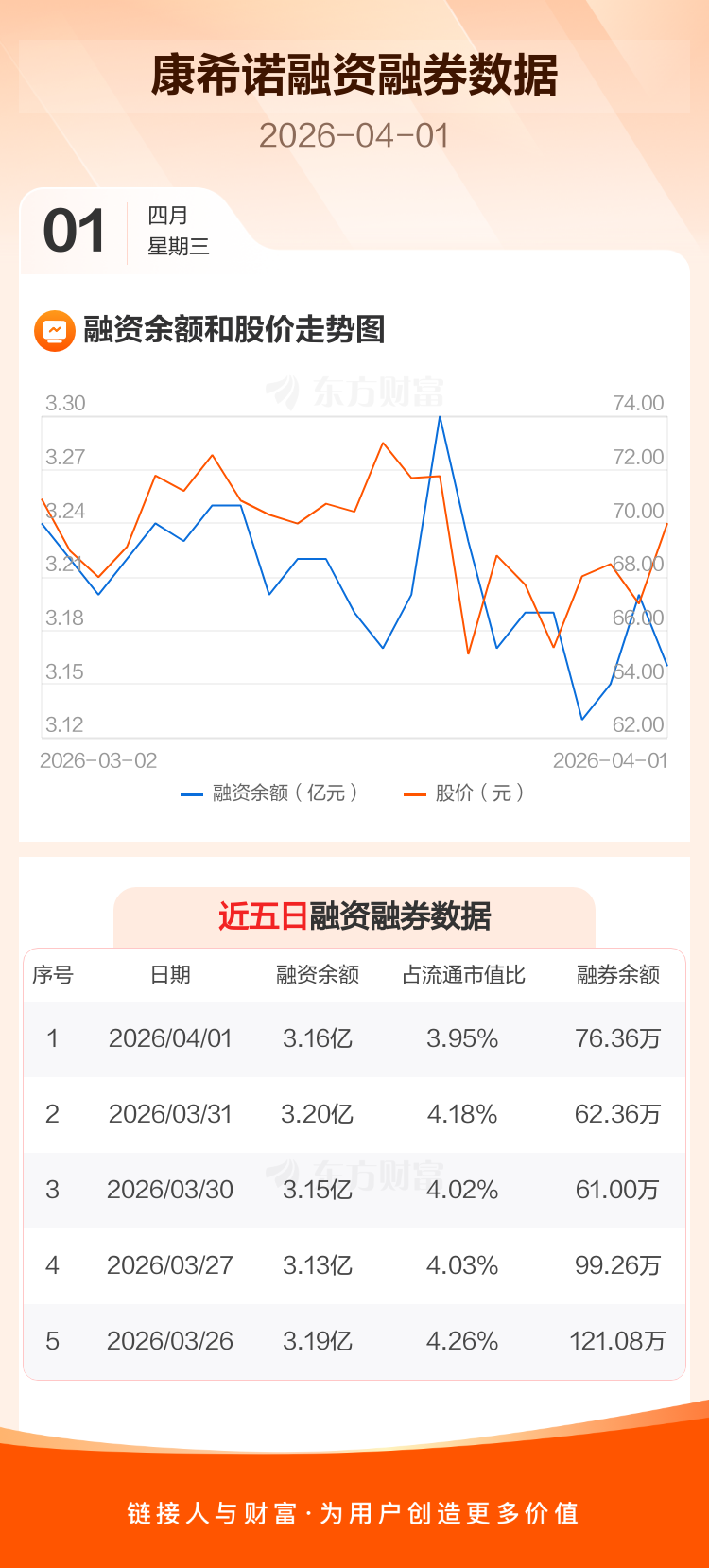 交易所最新数据显示,康希诺于2026年4月1日获融资买入1657.80万元,融资偿还2053.11万元,当日融资净偿还395.31万元。目前,该股融资余额3.16亿,占流通市值比例为3.95%。