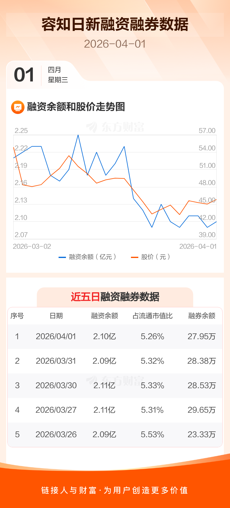 交易所最新数据显示,容知日新于2026年4月1日获融资买入744.46万元,融资偿还632.11万元,当日融资净买入112.36万元。目前,该股融资余额2.10亿,占流通市值比例为5.26%。
