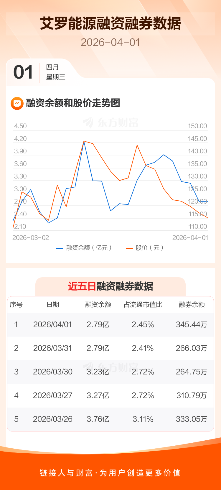 交易所最新数据显示,艾罗能源于2026年4月1日获融资买入7393.64万元,融资偿还7335.89万元,当日融资净买入57.75万元。目前,该股融资余额2.79亿,占流通市值比例为2.45%。