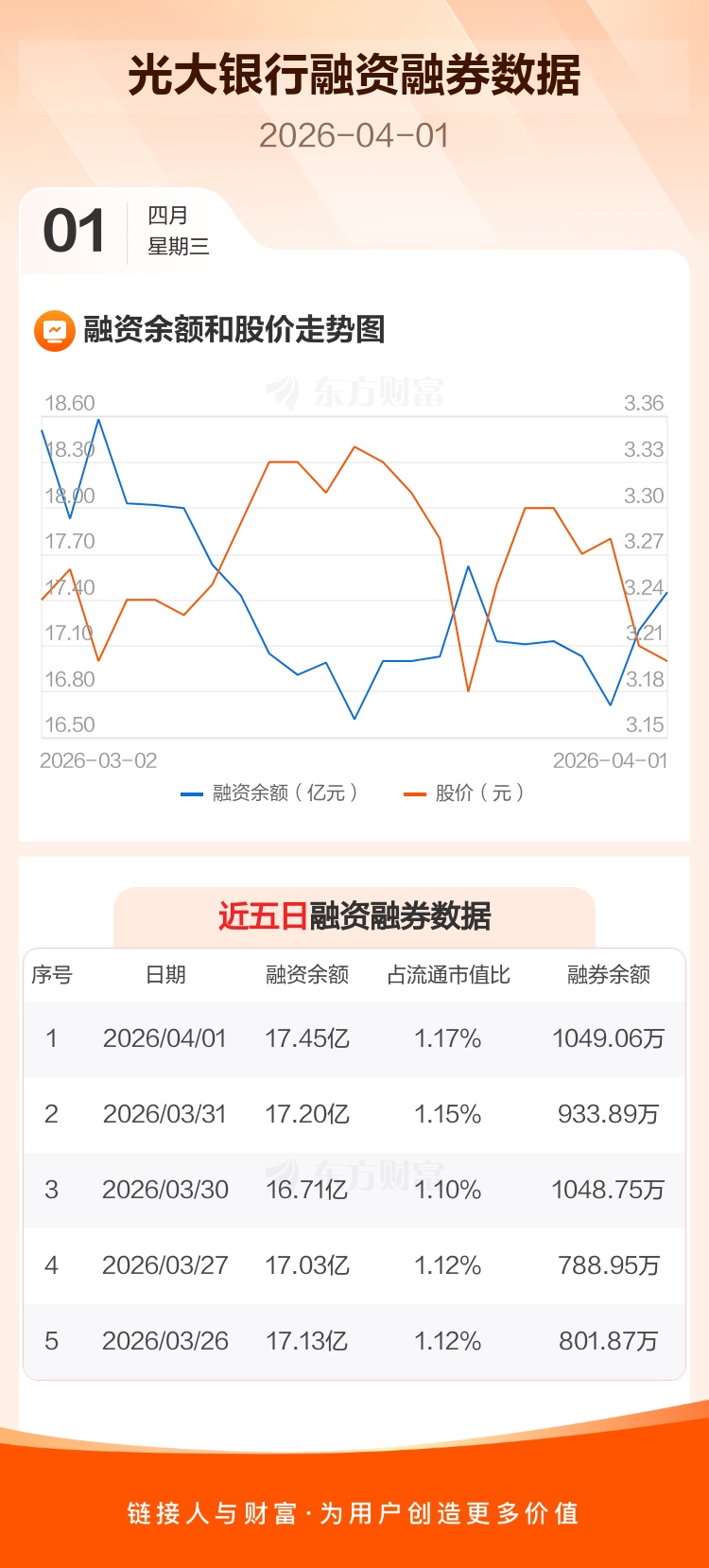 交易所最新数据显示,光大银行于2026年4月1日获融资买入1.77亿元,融资偿还1.52亿元,当日融资净买入2447.49万元。目前,该股融资余额17.45亿,占流通市值比例为1.17%。