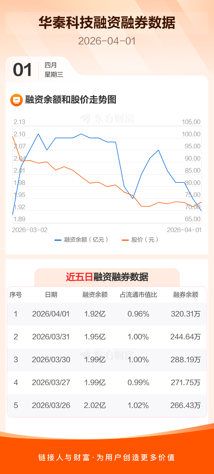 交易所最新数据显示,华秦科技于2026年4月1日获融资买入805.71万元,融资偿还1163.78万元,当日融资净偿还358.07万元。目前,该股融资余额1.92亿,占流通市值比例为0.96%。