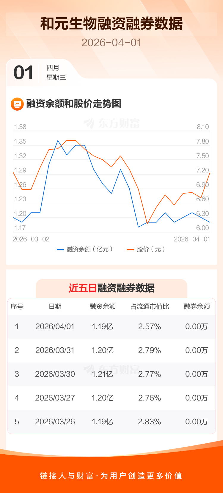 交易所最新数据显示,和元生物于2026年4月1日获融资买入730.32万元,融资偿还817.74万元,当日融资净偿还87.42万元。目前,该股融资余额1.19亿,占流通市值比例为2.57%。