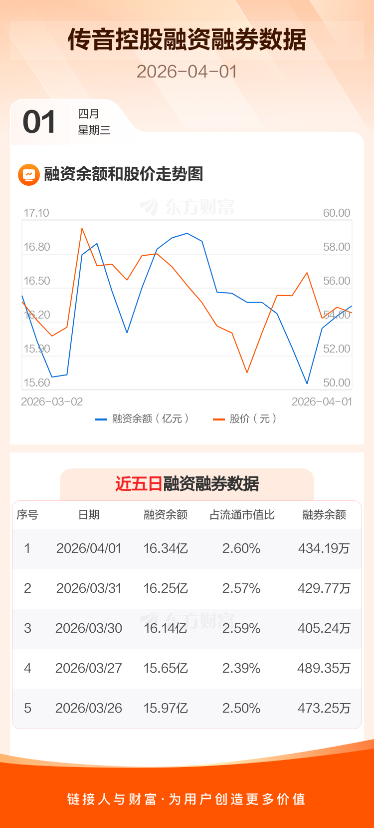 交易所最新数据显示,传音控股于2026年4月1日获融资买入6050.77万元,融资偿还5186.98万元,当日融资净买入863.79万元。目前,该股融资余额16.34亿,占流通市值比例为2.60%。