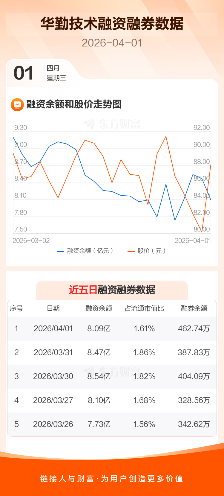 交易所最新数据显示,华勤技术于2026年4月1日获融资买入1.60亿元,融资偿还1.99亿元,当日融资净偿还3834.72万元。目前,该股融资余额8.09亿,占流通市值比例为1.61%。
