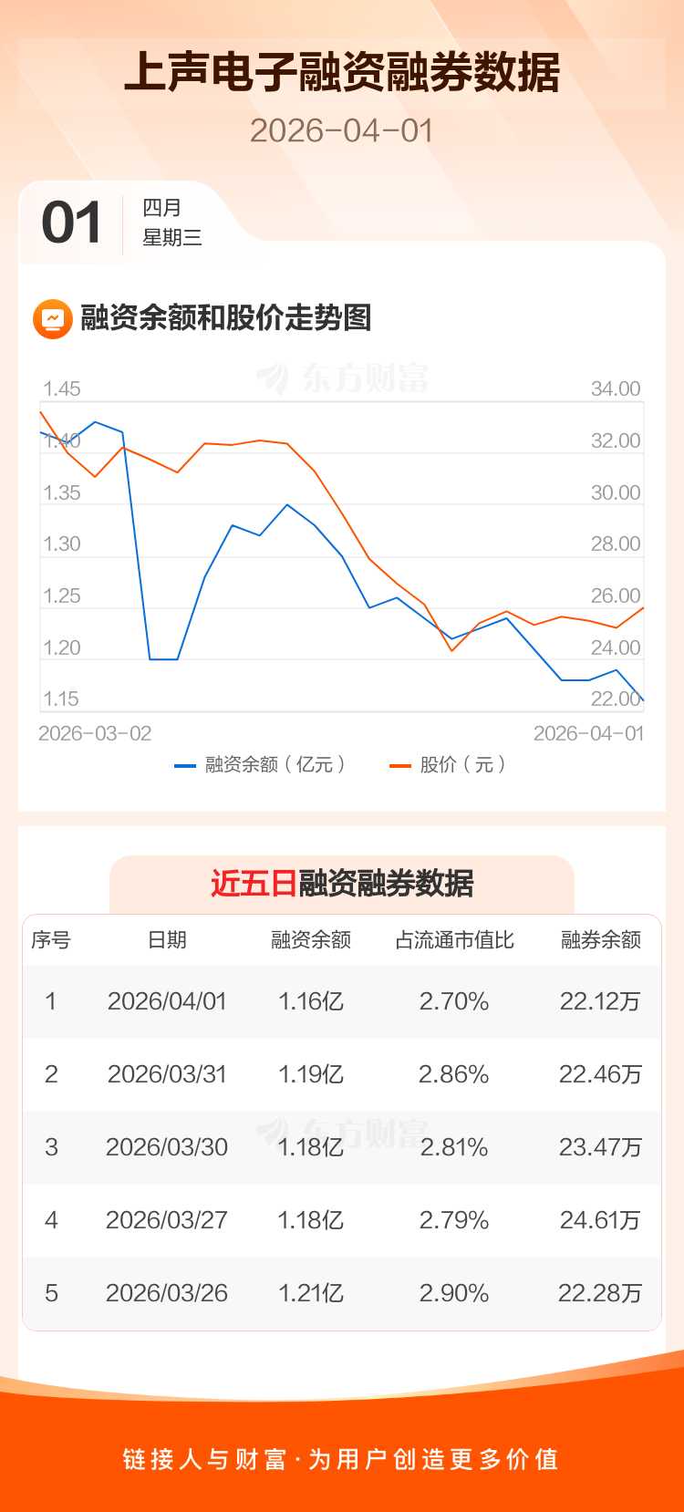 交易所最新数据显示,上声电子于2026年4月1日获融资买入314.55万元,融资偿还645.90万元,当日融资净偿还331.35万元。目前,该股融资余额1.16亿,占流通市值比例为2.70%。