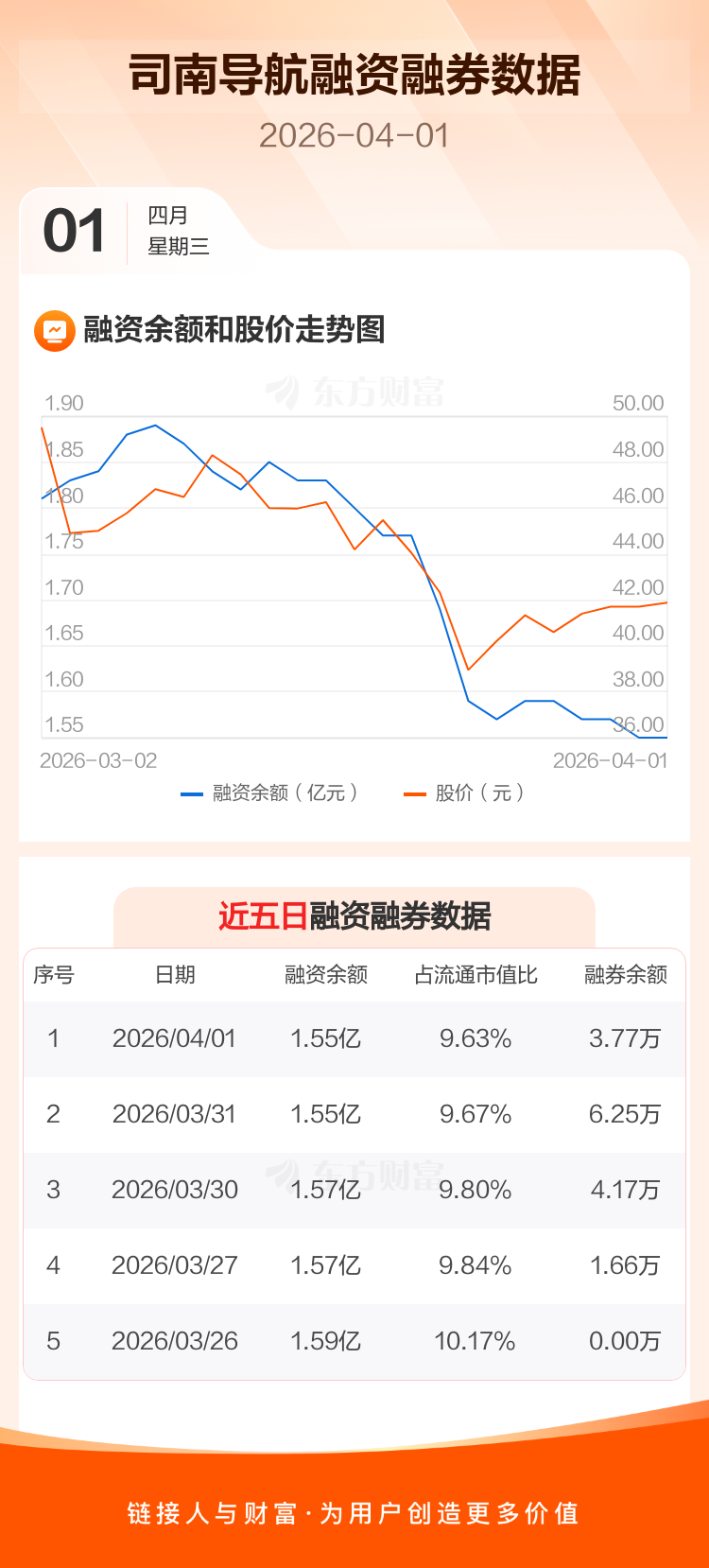 交易所最新数据显示,司南导航于2026年4月1日获融资买入304.11万元,融资偿还304.99万元,当日融资净偿还8741元。目前,该股融资余额1.55亿,占流通市值比例为9.63%。