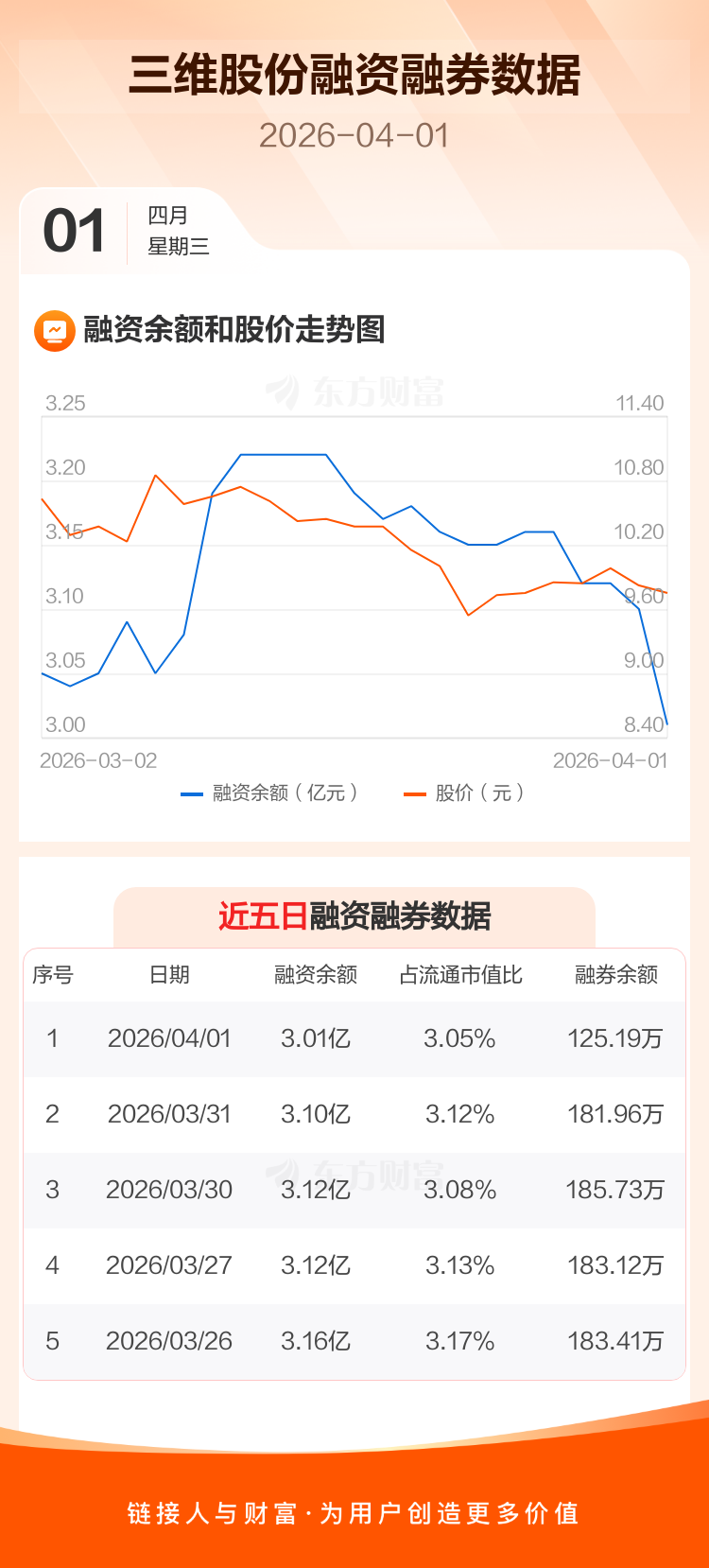 交易所最新数据显示,三维股份于2026年4月1日获融资买入322.09万元,融资偿还1265.15万元,当日融资净偿还943.06万元。目前,该股融资余额3.01亿,占流通市值比例为3.05%。